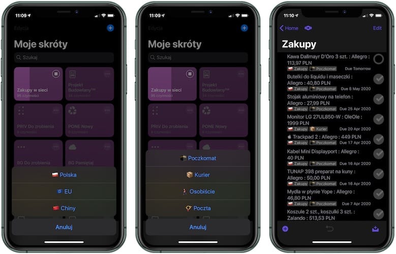 Shortcuts dla Omnifocus. Tworzy zadania z terminem zależnym od tego w jakim sklepie zrobiliśmy zakupy i jaki jest przybliżony czas dostawy. Zakupy w chińskich sklepach mają ustawiony długi due date. Po uruchowmieniu wybieramy z jakiego sklepu zrobiliśmy zakupy, jaka jest forma dostawy (kurier, paczkomat, odbiór osobisty).